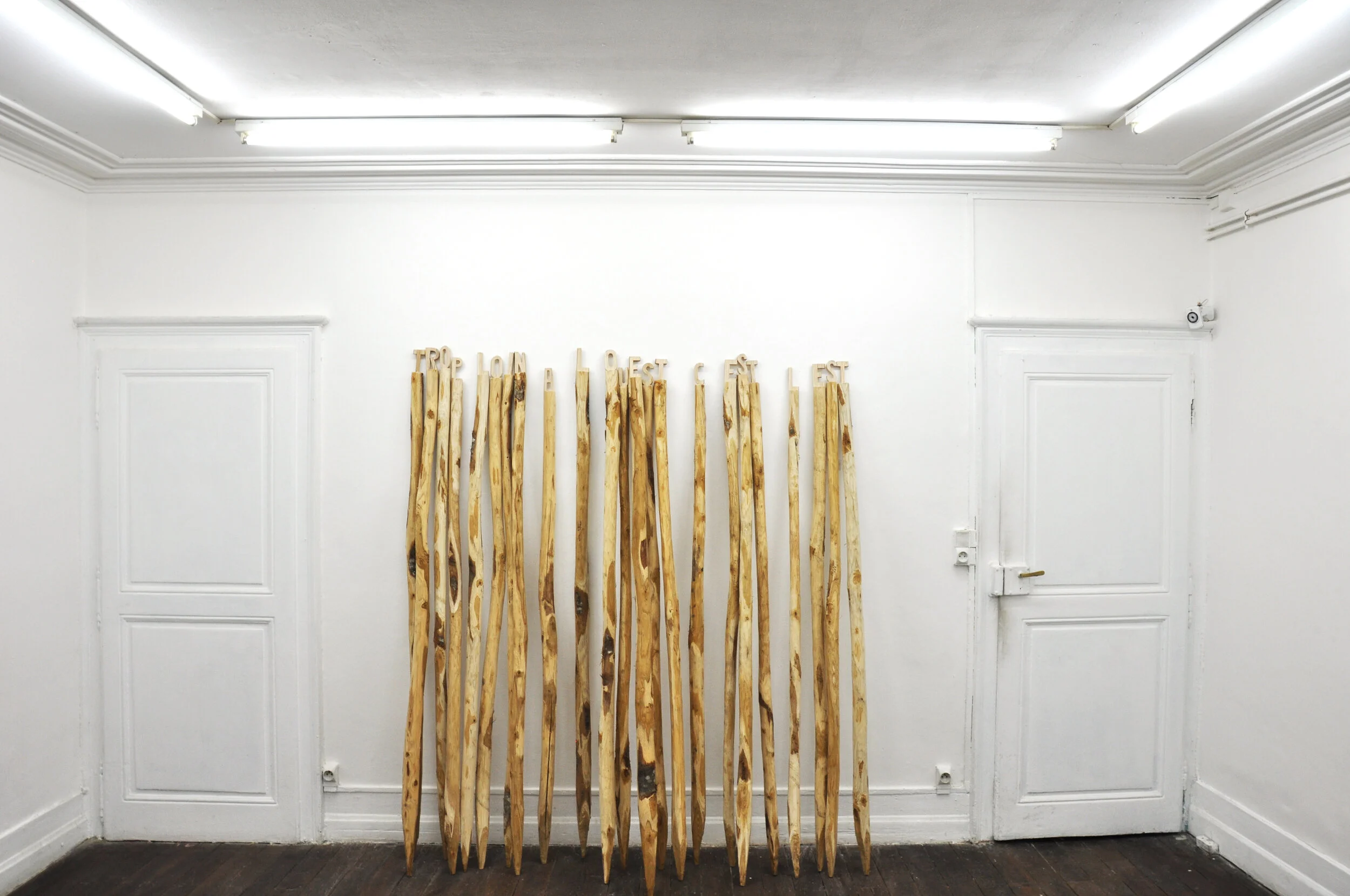 Le titre de l'exposition de Benjamin Sabatier au premier niveau d'ELEVENSTEENS renvoie à ce que l'on appelle, dans la construction architecturale, le « gros oeuvre ». Le gros œuvre est l'ensemble des ouvrages de l'édifice qui concourent à la reprise des efforts subis en permanence par la construction (les charges reçues et le poids propre de l'édifice) et tout ce qui concourt à la solidité, à la stabilité de l'édifice. Murs porteurs, poteaux, poutres, planchers, charpentes, fondations, etc. tout un vocabulaire que l'on a en tête en voyant les sculptures présentées. Pour essayer d'en savoir plus, et d'éclairer sa démarche, ELEVENSTEENS posent trois questions à l'artiste. Composé pour la plupart de béton et de poutres de charpentes, l'ensemble de tes sculptures, sous un aspect brutal, nous semble pourtant fragile.