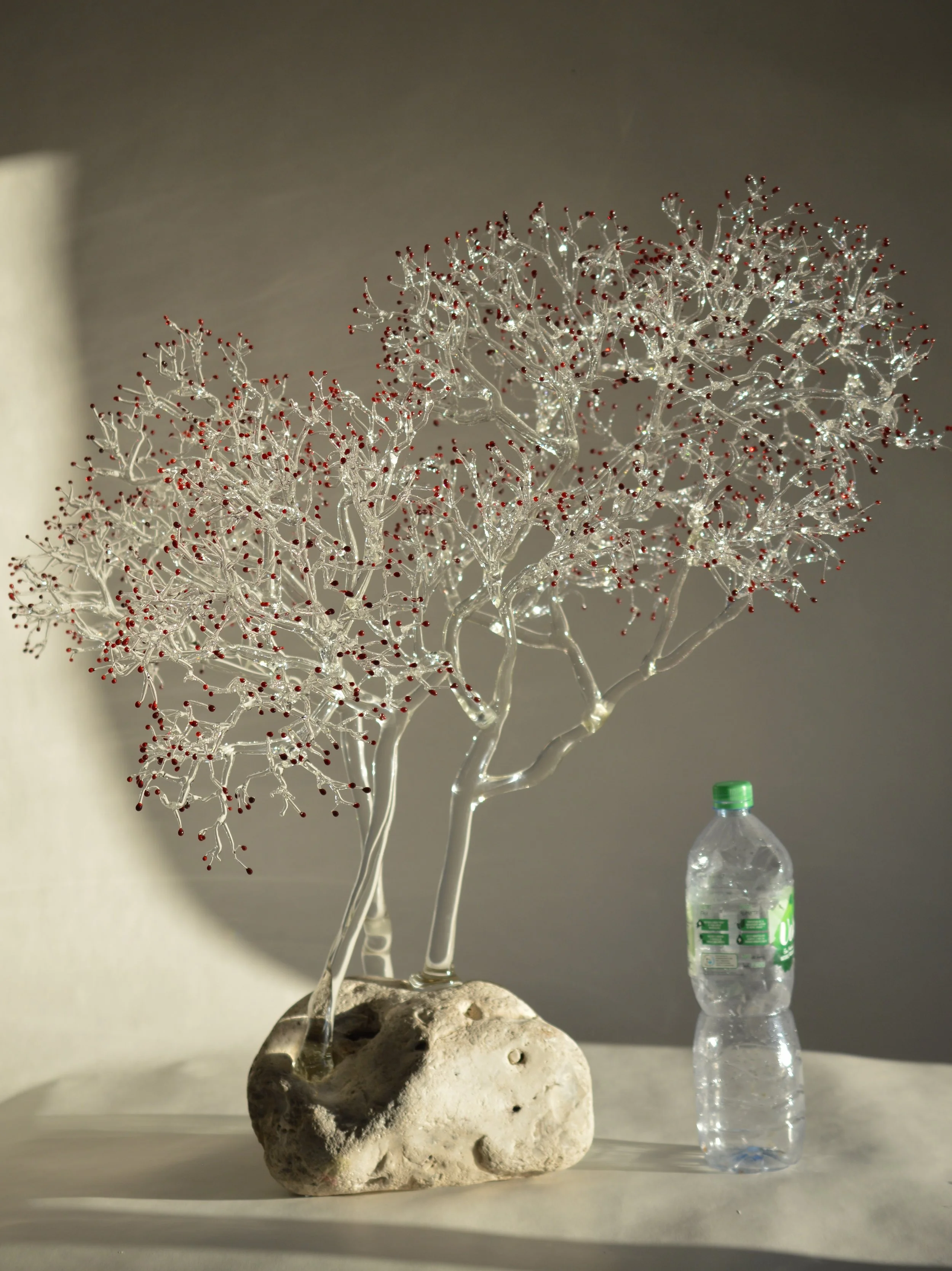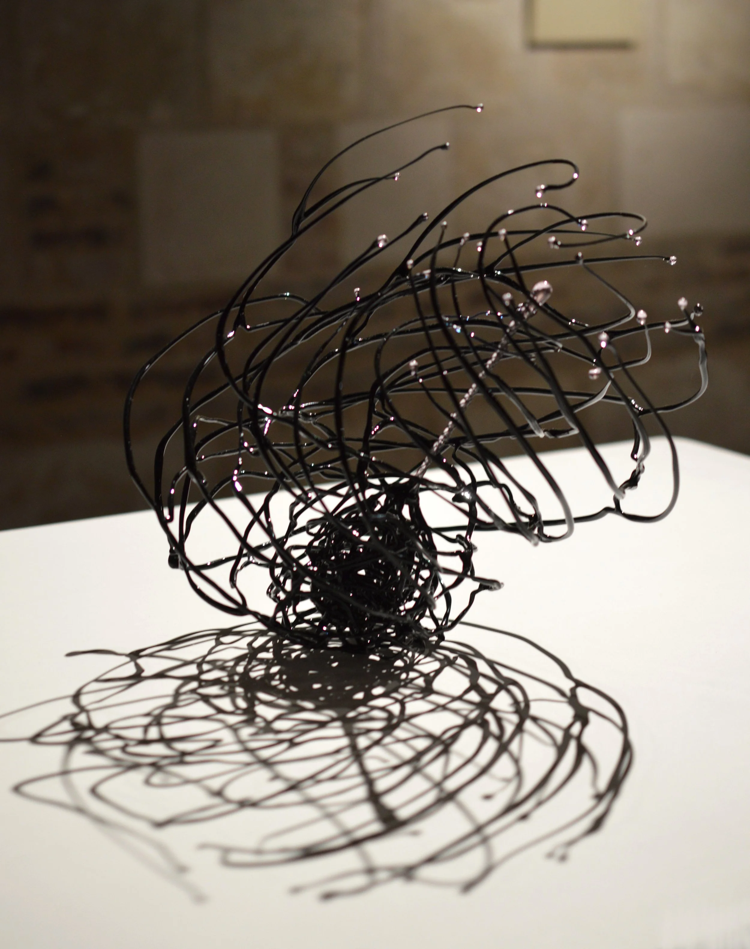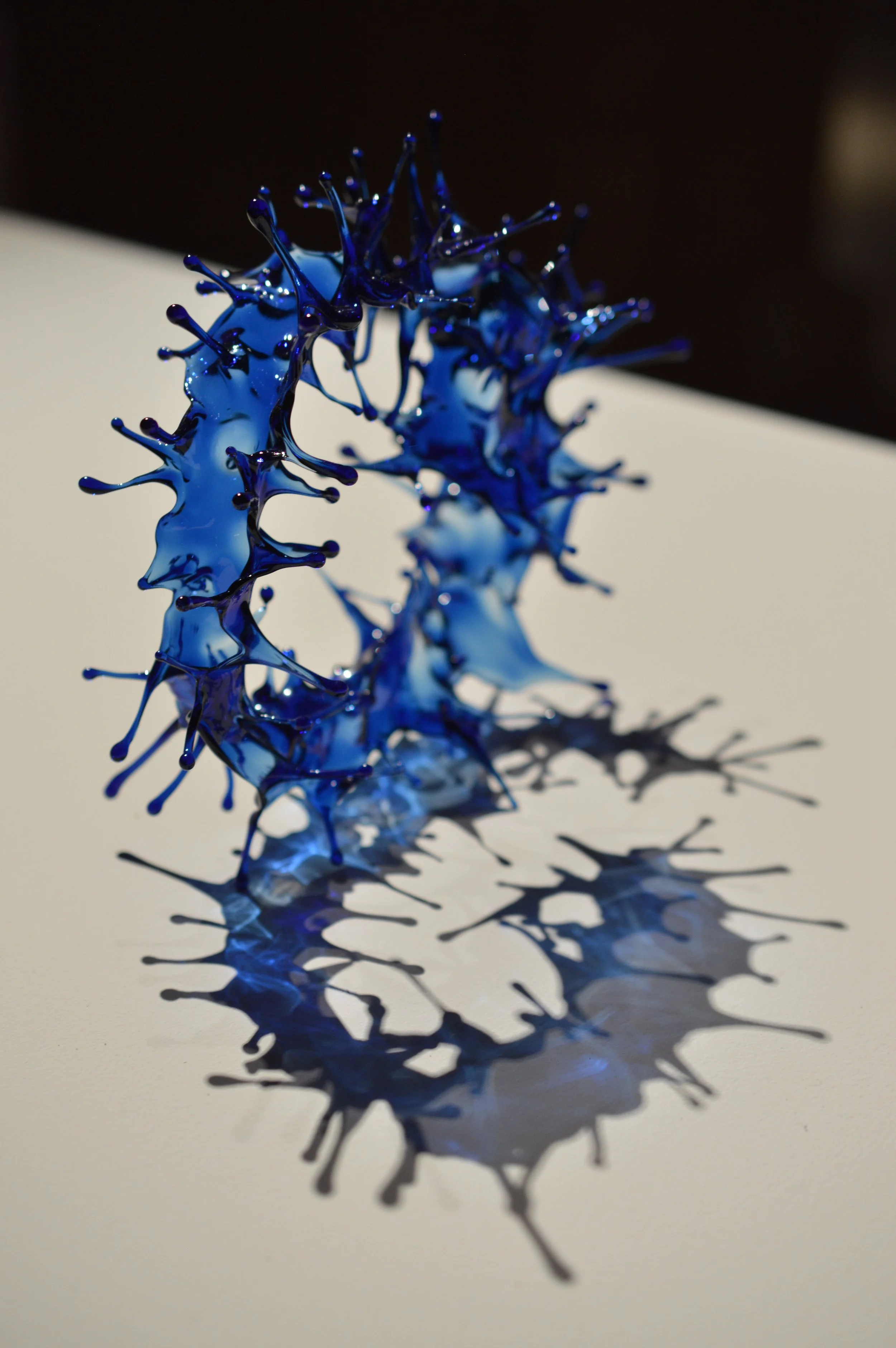 The works of Julie Legrand act on us as sensory transmitters. They are colorful, bursting with life, delicate, and fragile. If the tongue transforms external elements into emotions, tastes, Julie Legrand’s sculptures offer the reverse path. With the same sensory precision as our mucous membranes, she creates forms extracted from the magma of her emotions, freezes molten glass to make perceptible to others what is within her. «Ca- lice 2020» eroticizes matter through color. A feeling of moisture, dew, is created in its fine glass droplets, like the eros of taste on our tongue. The invisibility of emotions takes crystalline curves, plays with light, shifts the scale of perception by merging the thing in itself and in front of itself. Our eyes become like tongues that test, taste these explosive forms of flavors. Materials intermingle in the alchemy of their skin, hardness, or fragility. Like a dish on our tongue, Julie Legrand’s works spin our emotional taste buds. In «Les désirs contraires 2020,» just like in our mouths, there is no up or down. The sculpture is spatialized, immobilized in its weightlessness. We feel Julie Legrand’s works without ever fully grasping them; they evoke a sensory resonance in us that does not belong to sight, like the orgasmic touch of our tongue.